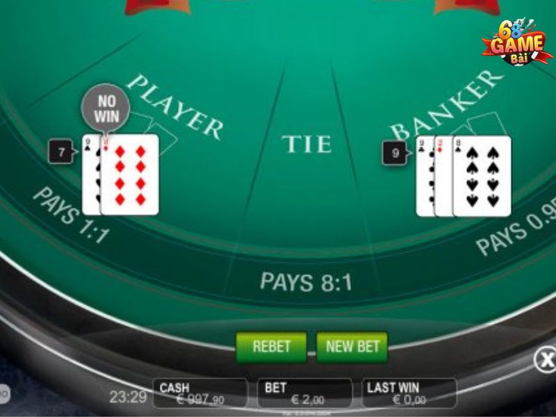 • Mục tiêu: Người chơi tham gia cá cược và đặt tiền, dự đoán tổng số điểm gần với 9 nhất. Trên màn hình sẽ hiển thị 3 cửa cược chính là Player (Người chơi), Banker (Nhà cái) và Tie (Cừa Hòa).