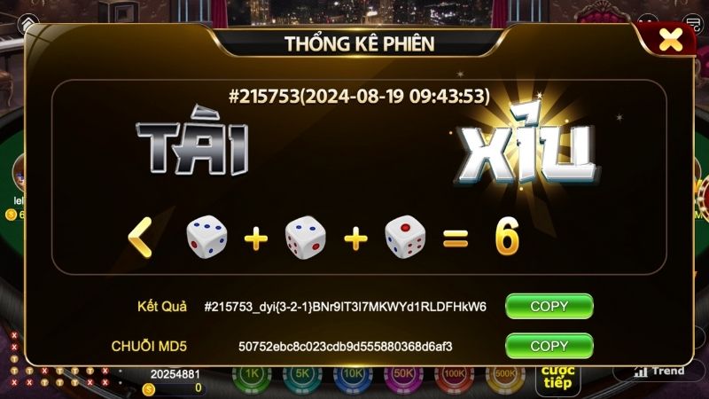 Nếu kết quả cửa cược của bạn trùng với kết quả được công bố, thì bạn đã giành chiến thắng. Người chơi cần lưu ý cách tính điểm cược trong Tài Xỉu: ví dụ đặt cược 10 điểm tương ứng với 10.000 VNĐ; đặt cược 10K điểm tương ứng với 10.000.000 VNĐ.