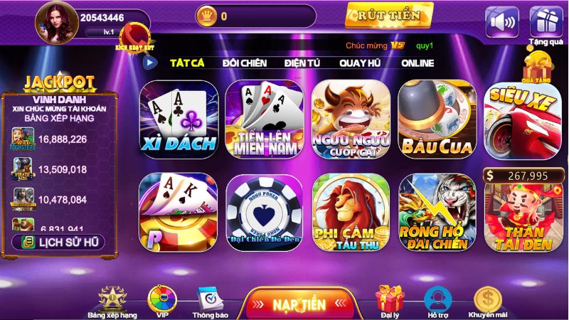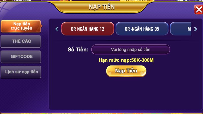 Để tham gia vào các ván bài thực tế, bạn cần nạp tiền vào tài khoản. Cổng  hỗ trợ nhiều phương thức nạp tiền như: Chuyển khoản ngân hàng. Ví điện tử (Momo, ZaloPay). Thẻ cào điện thoại. Sau khi chọn phương thức phù hợp, bạn chỉ cần điền thông tin và số tiền muốn nạp, sau đó xác nhận giao dịch rồi đợi vài phút để tiền được chuyển vào.